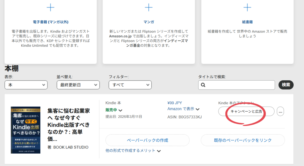KDPの「本棚」から、「キャンペーンと広告」をクリック