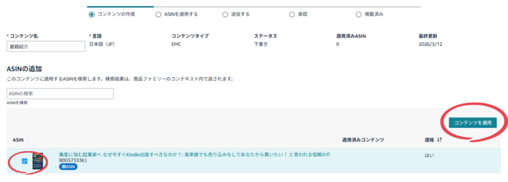 貼り付けると、下に商品が現れますので、チェックを入れて、「コンテンツを適用」をクリックします。