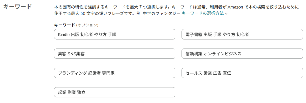 読者が検索しそうな言葉を、7つ登録しましょう。本を見つけてもらいやすくするために、非常に重要な設定になります。