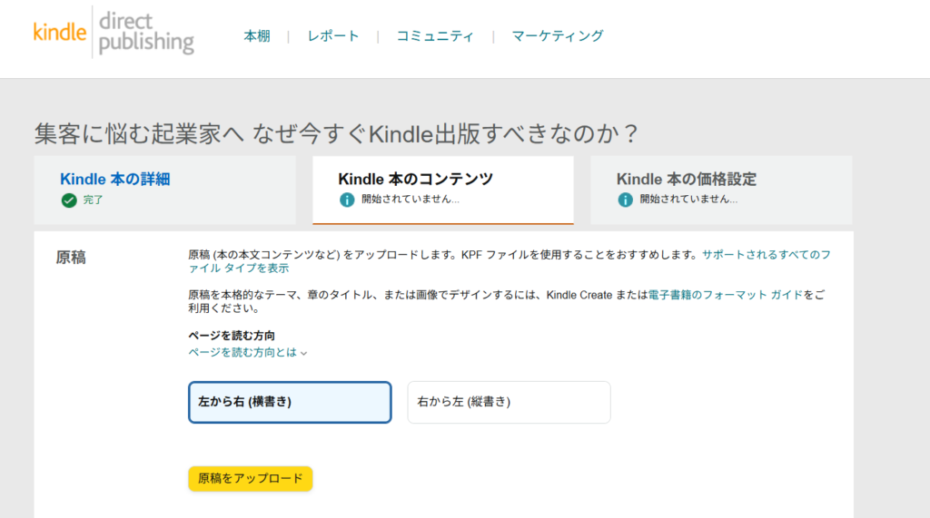 ページを読む方向」はご自身の原稿に合ったものを選択し、「原稿をアップロード」を押してEPUBファイルをアップロードしてください。