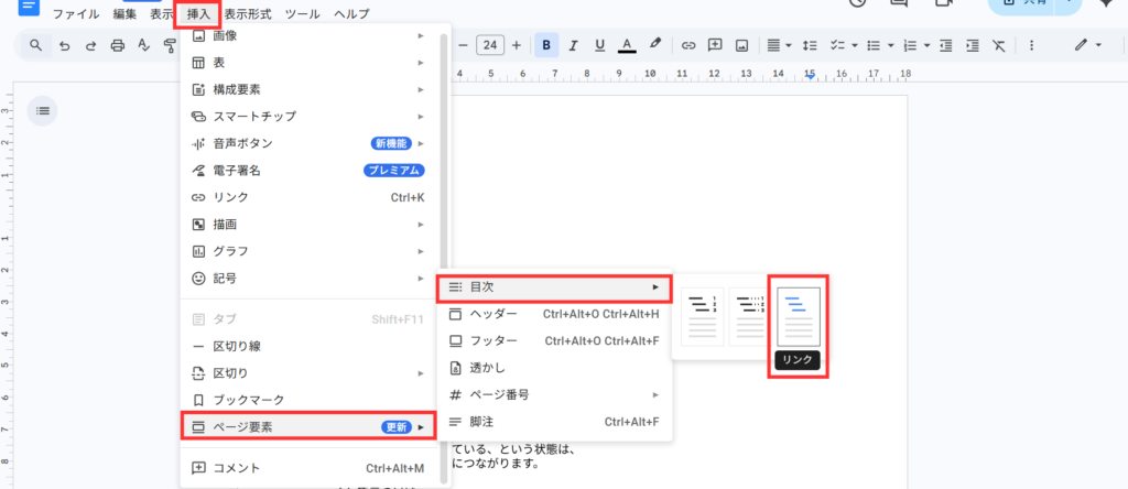 「挿入」 > 「ページ要素」 > 「目次」 > 「リンク」