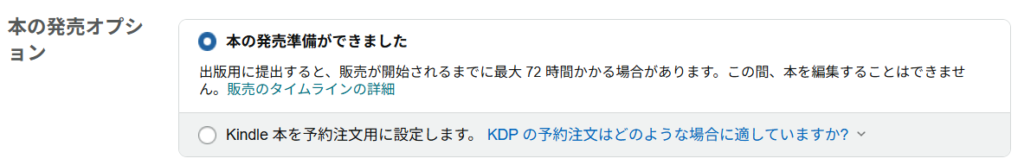 Kindle本をKDPで入稿していると、「本の発売オプション」という項目が表示されます。